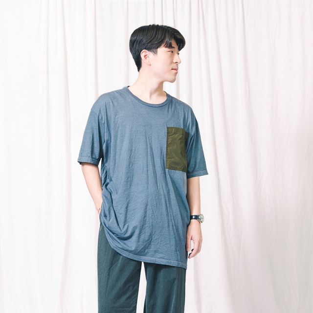 古着のTシャツを漂白・洗浄後、スレン染料で丁寧に染め直し、ビンテージのミリタリーウェアのポケットを解き新たにあしらった作品です。手染めならではの自然なムラ感が生まれていますので、風合いとしてお楽しみください。 廃棄されるはずだった生地を活かすことで、私たちの未来にほんの少しでも貢献できれば――そんな想いから生まれた一着です。 限られた素材を用いて、すべて一点ずつの手仕事で仕立てています。そのため、大量生産や再生産は行っておりません。 一期一会の出会いを、どうぞお楽しみください。 サイズ 身幅60 着丈82 肩幅53 袖丈20