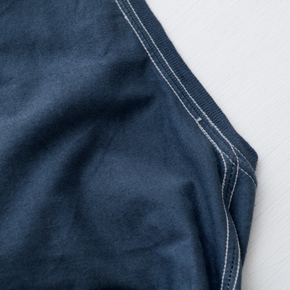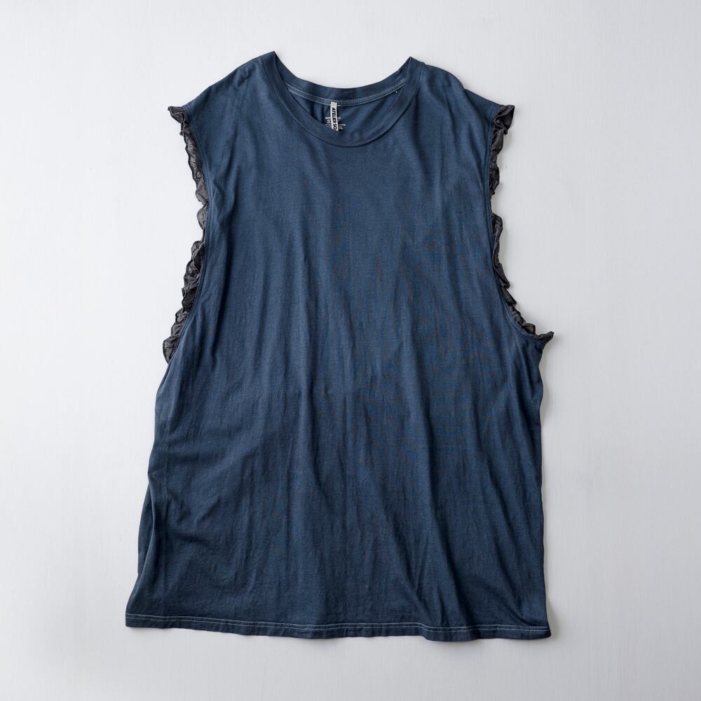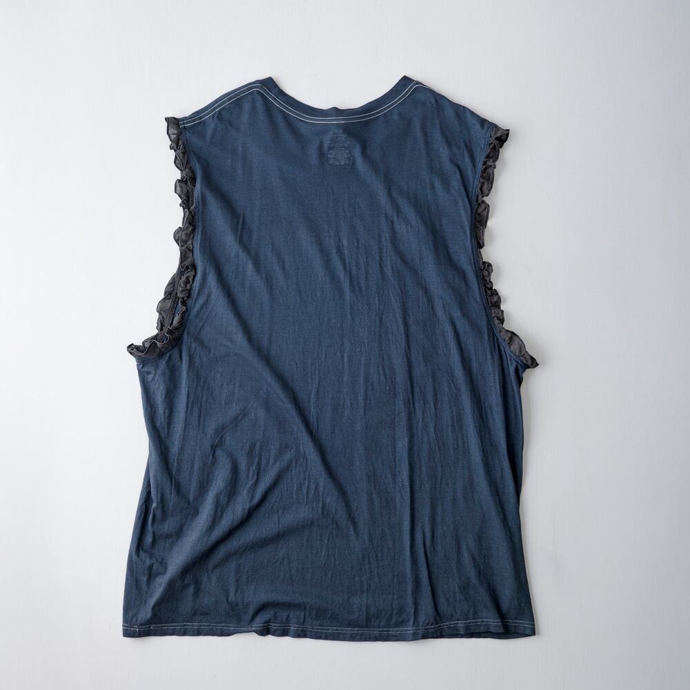古着のTシャツを漂白・洗浄後、スレン染料で丁寧に染め直し、ワイドシルエットのノースリーブTeeへとリメイクしました。