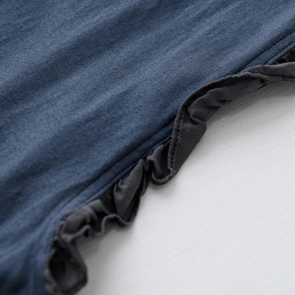 もとのTシャツは袖付近に大きなダメージがあり、サイズもかなり大きめでしたが、あえて大胆に袖をカットし、別布でフリルをプラスすることで新たなデザインに仕上げています。