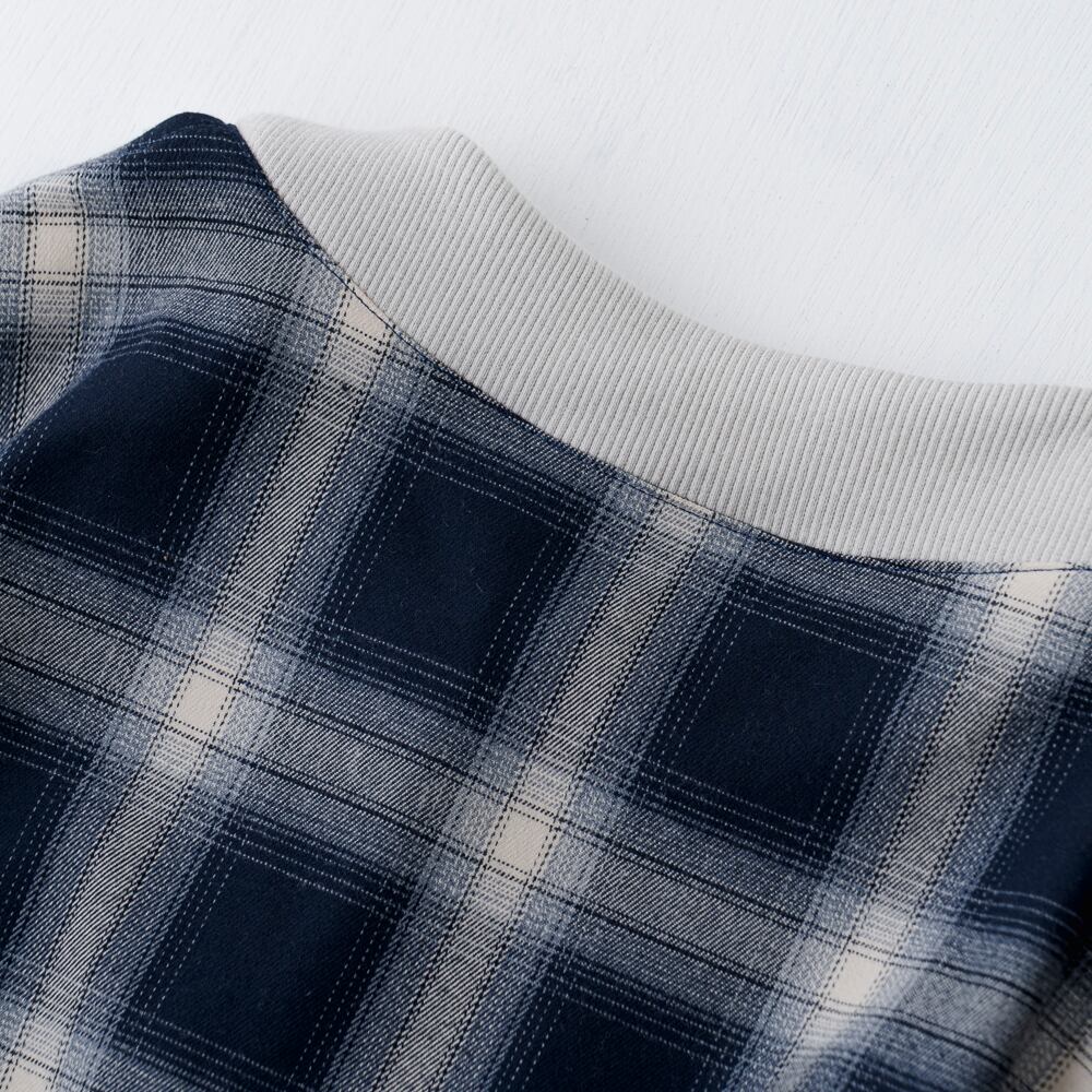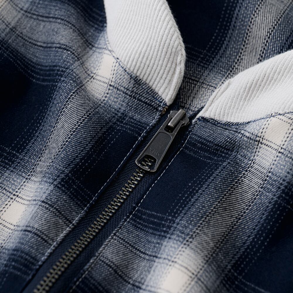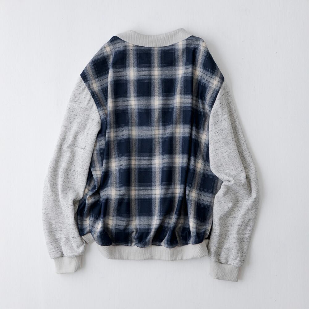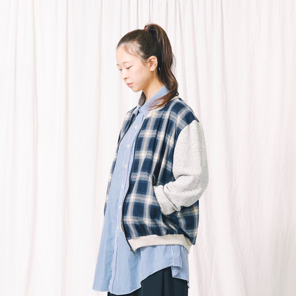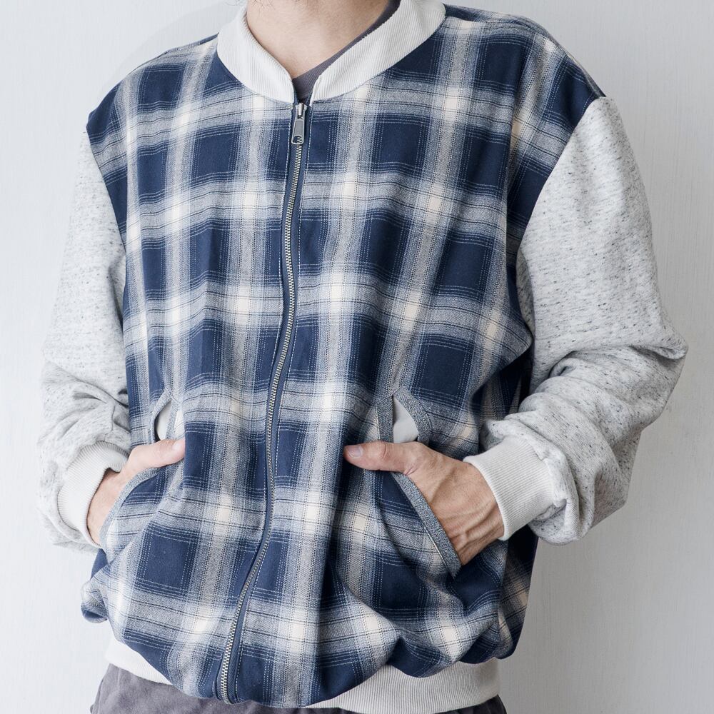 ドメスティックブランドで使われていた国産の廃棄生地を組み合わせたメンズサイズのブルゾンです。柔らかなグラデーションが魅力的な、オンブレチェックをメインに、杢グレーの上質なコットンニットを袖に合わせた作品です。