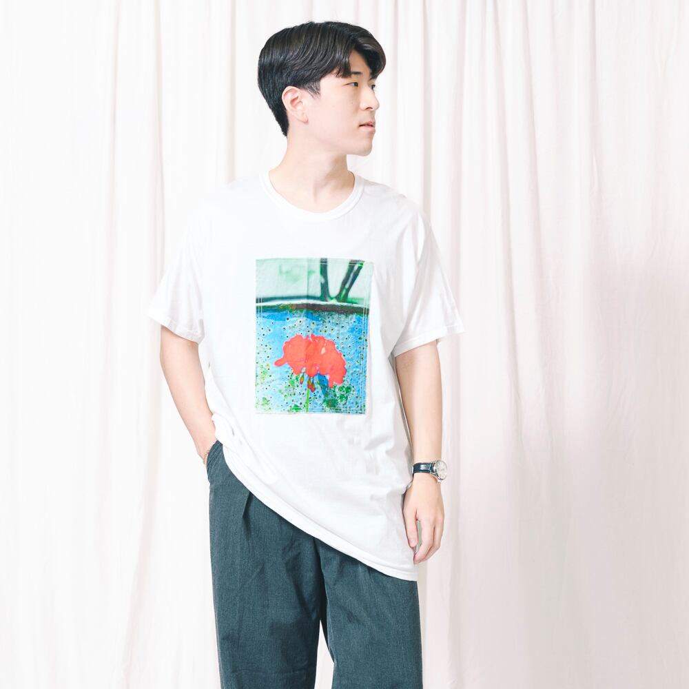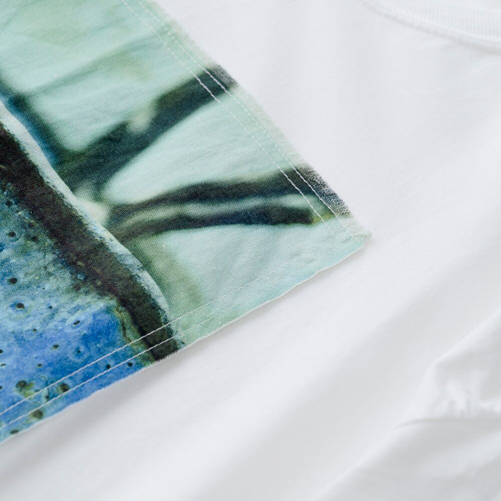 古着のTシャツを漂白・洗浄し、ATELIER SO_MARUオリジナルのフォトファブリックをパッチした作品です。
