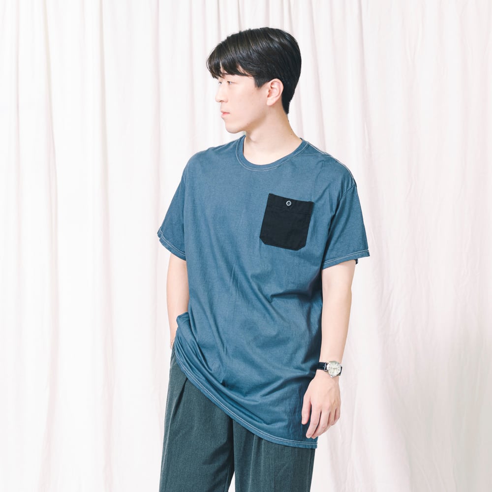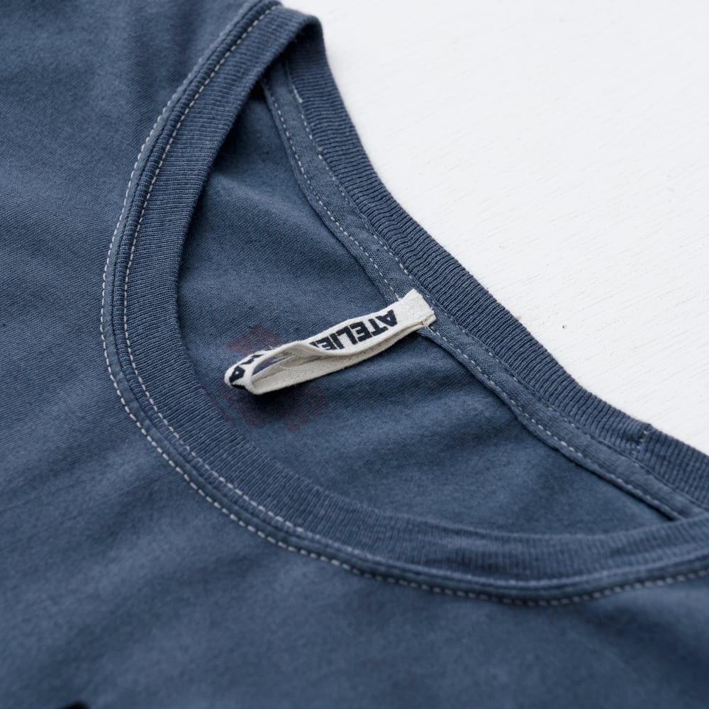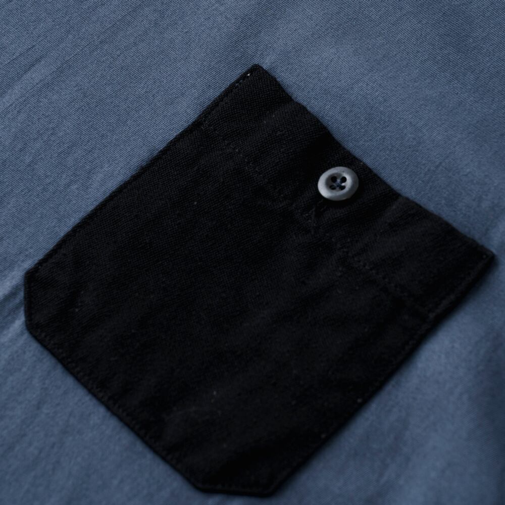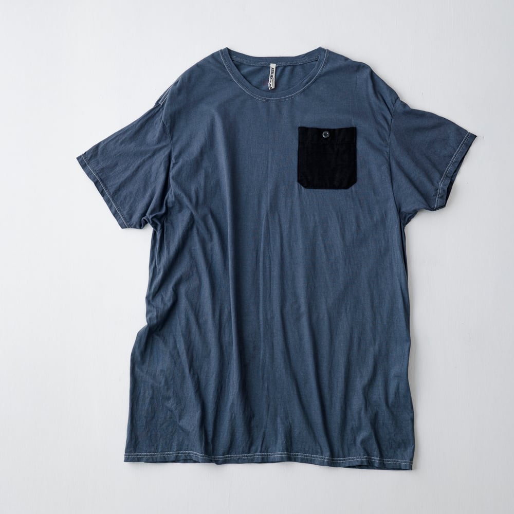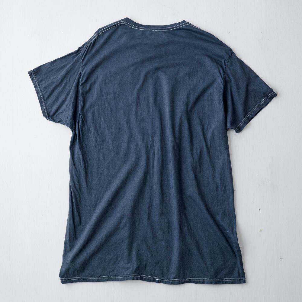 古着のTシャツを漂白・洗浄後、スレン染料で丁寧に染め直し、ビンテージのミリタリーウェアのポケットを解き新たにあしらった作品です。手染めならではの自然なムラ感が生まれていますので、風合いとしてお楽しみください。