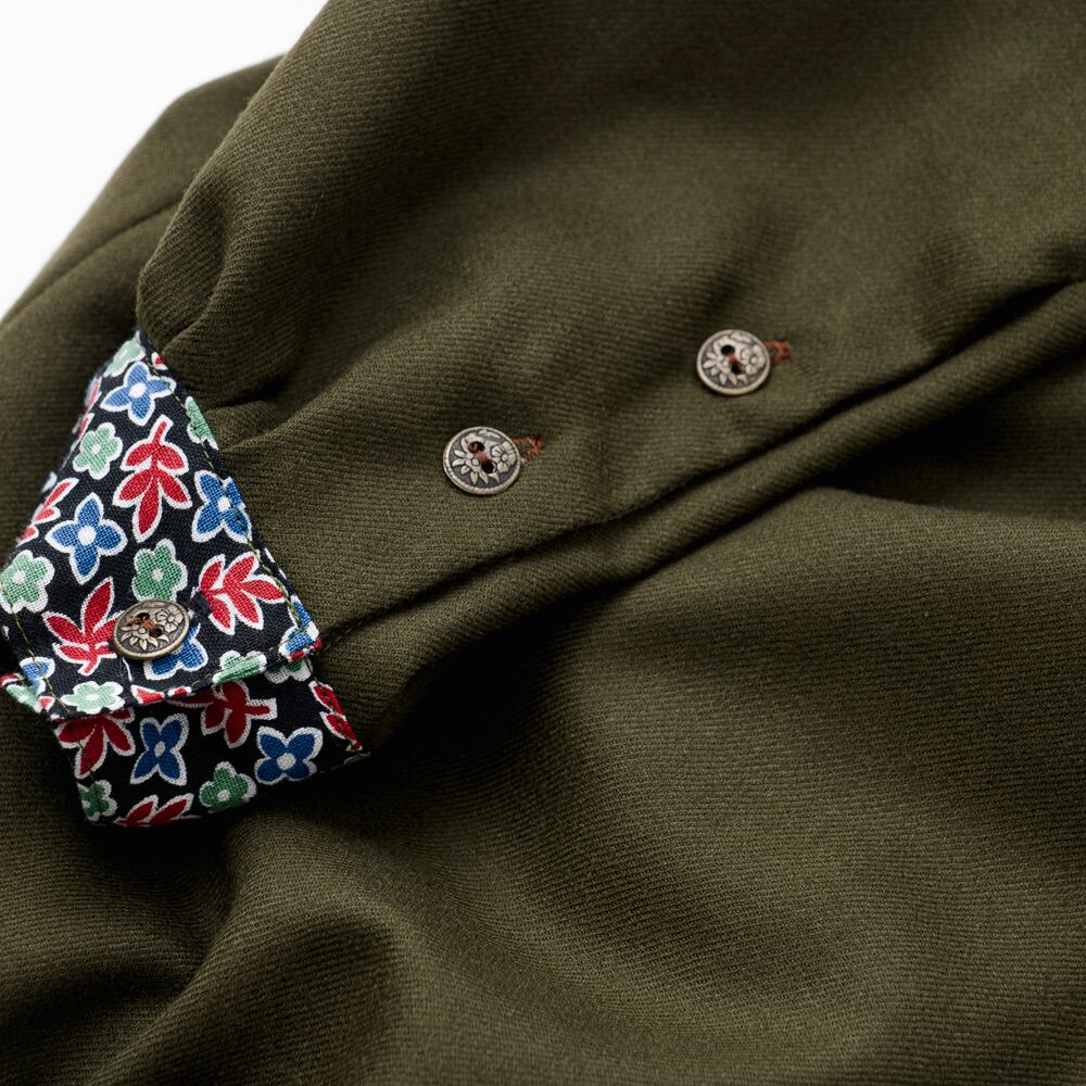 日本の縫製工場から出たウール調の残反をメインに、ヴィンテージの花柄ファブリックを襟とカフスにあしらった作品です。