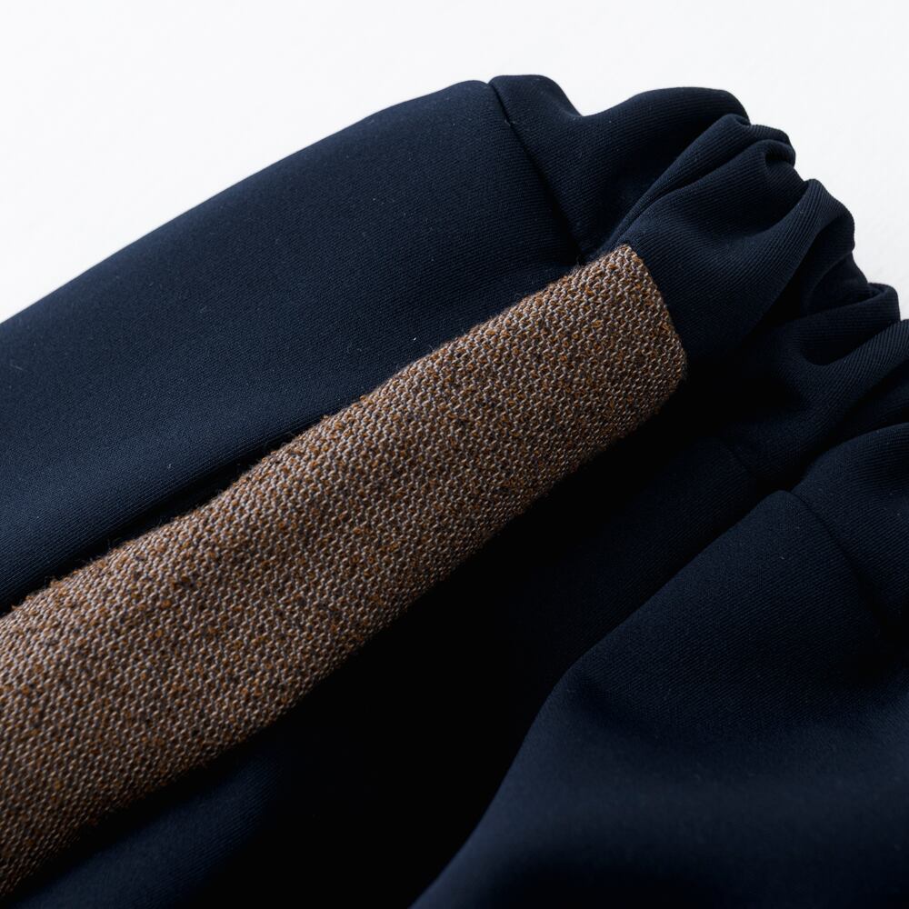 サイドに異素材で切り替えを作り、シンプルながらコーディネートのアクセントに。