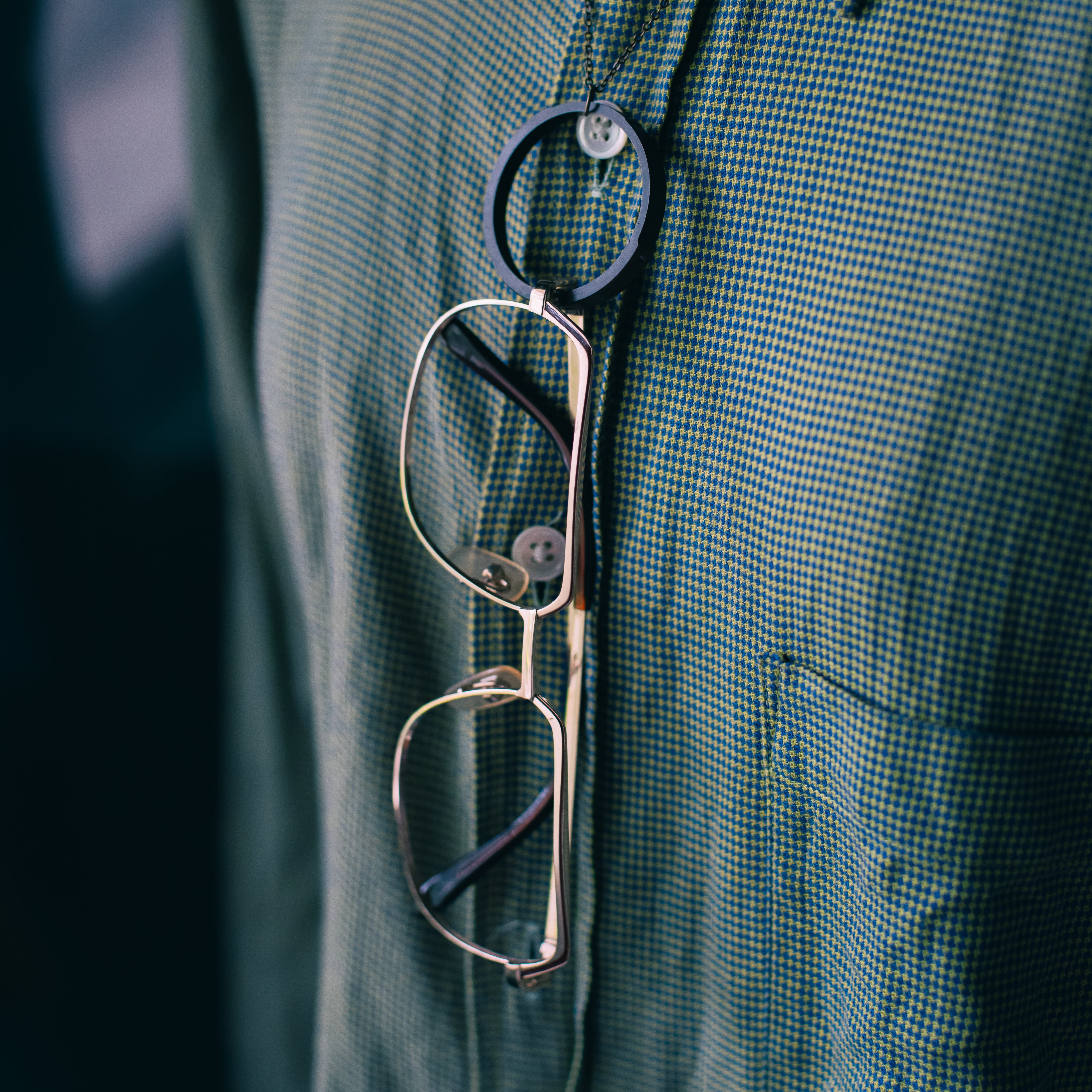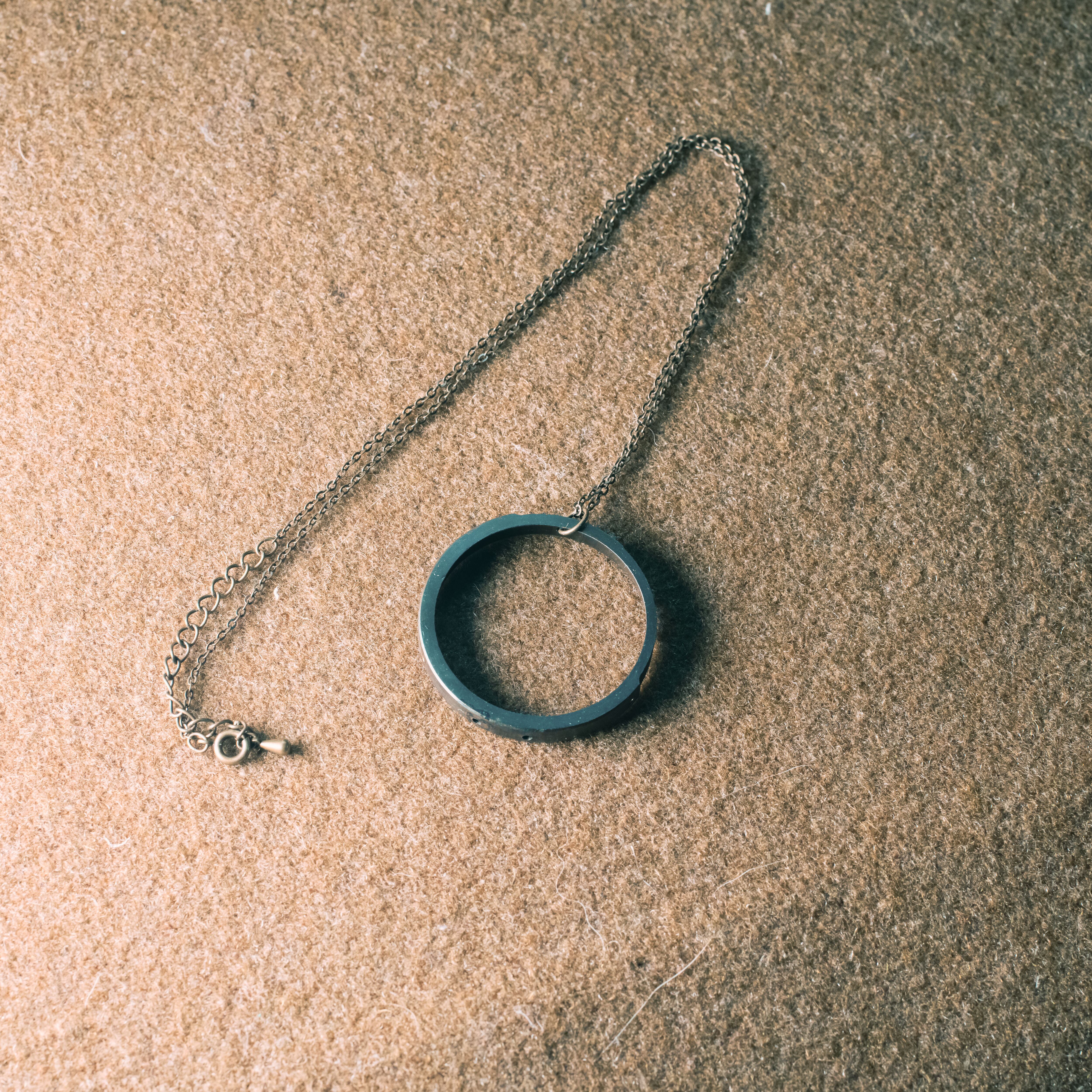 カビや破損のあるレンズを分解し、出てきた部品を使ったメガネをかけるネックレスです。