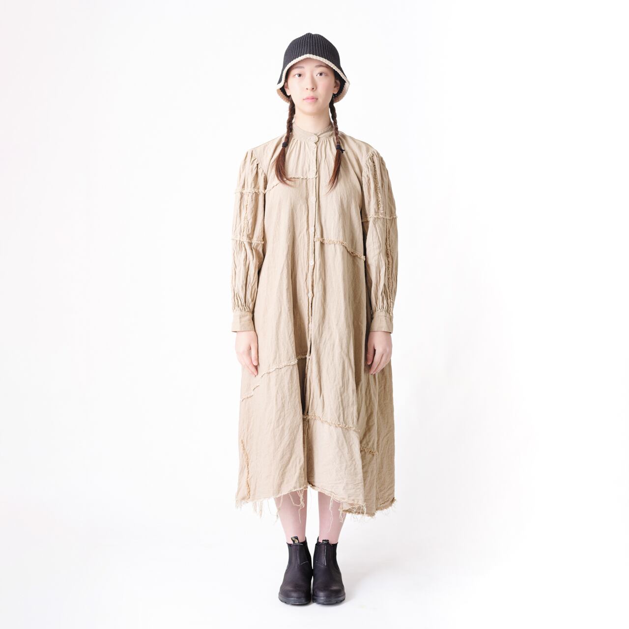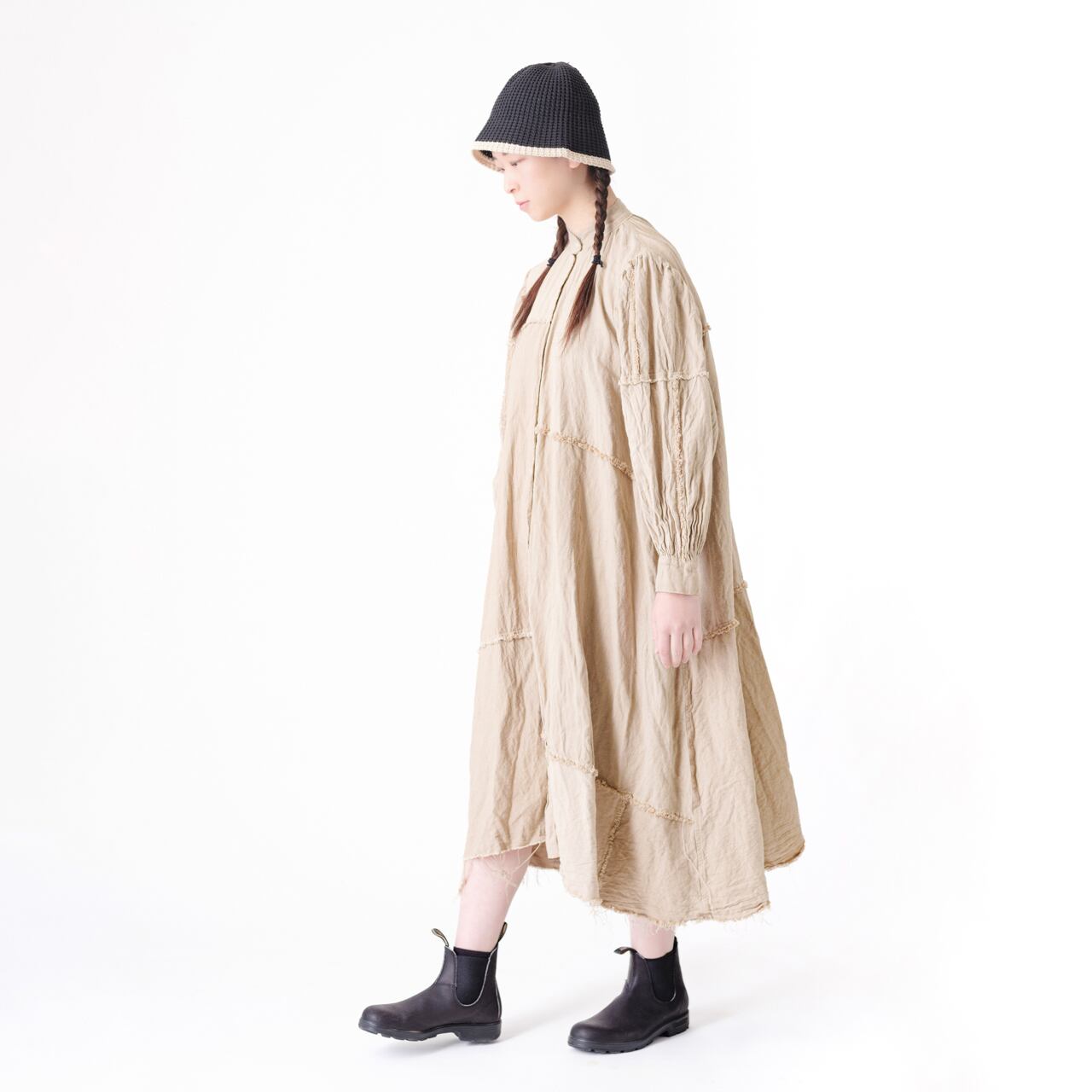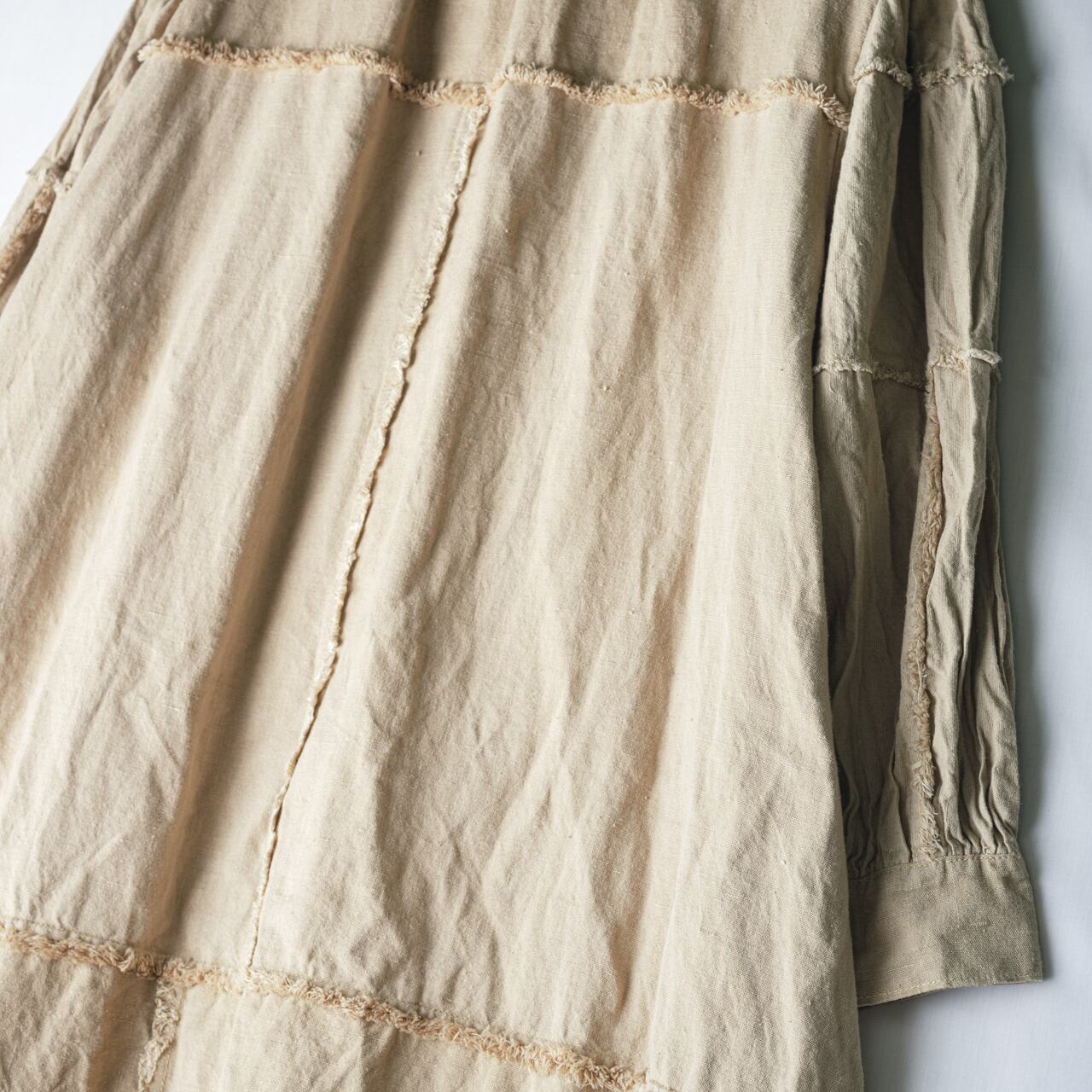 つぎはぎのニュアンスをそのままに、縫い合わせを表に、裾は切りっぱなしになっています。