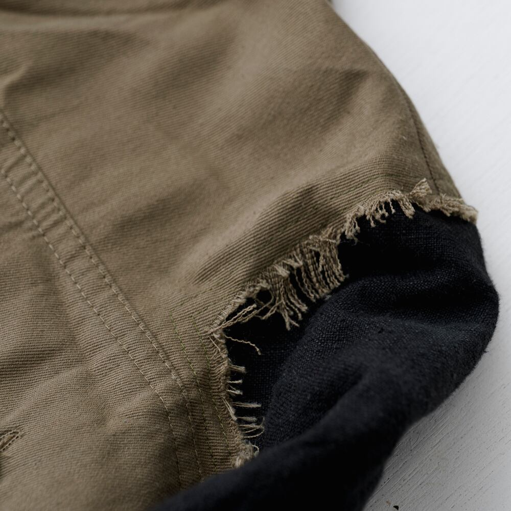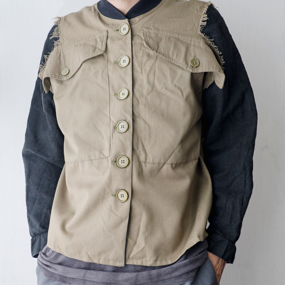 アームホールにはあえて縫い代を表に出し、切りっぱなしで仕上げています。全体の色褪せたトーンと複雑な形を活かし、つぎはぎ感や粗さをあえて残した、再構築ならではの一着です。