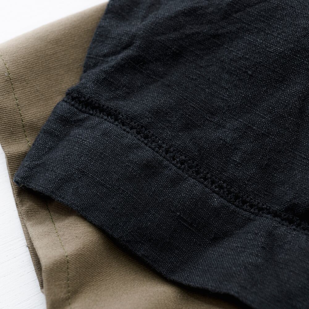 襟にはリブを合わせ、袖には古い平織りのリネン生地を使用。どちらも使い込まれた素材ならではの、味のある風合いが特徴です。