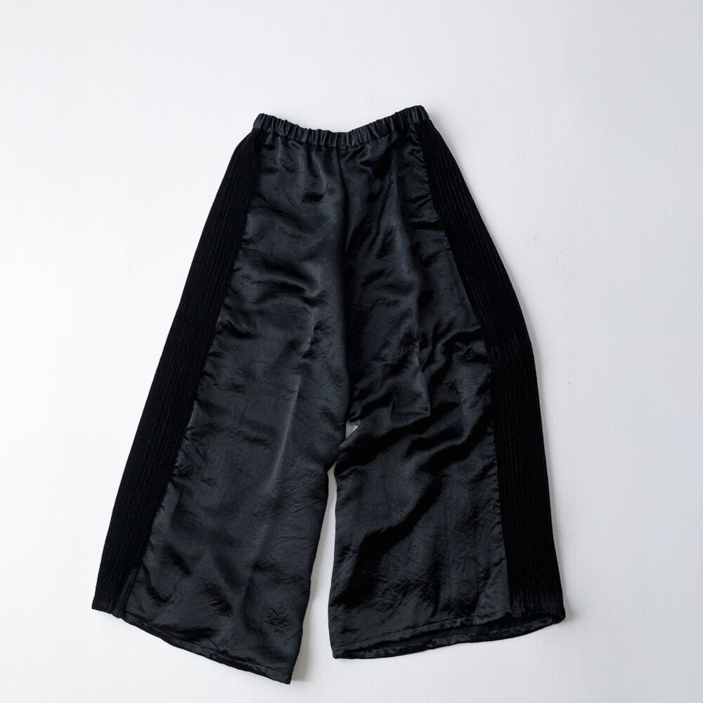 ボロボロになっていたニットシャツを分解し、状態の良い部分を抽出。光沢感のある残反と組み合わせて仕立てたフレアシルエットのパンツです。