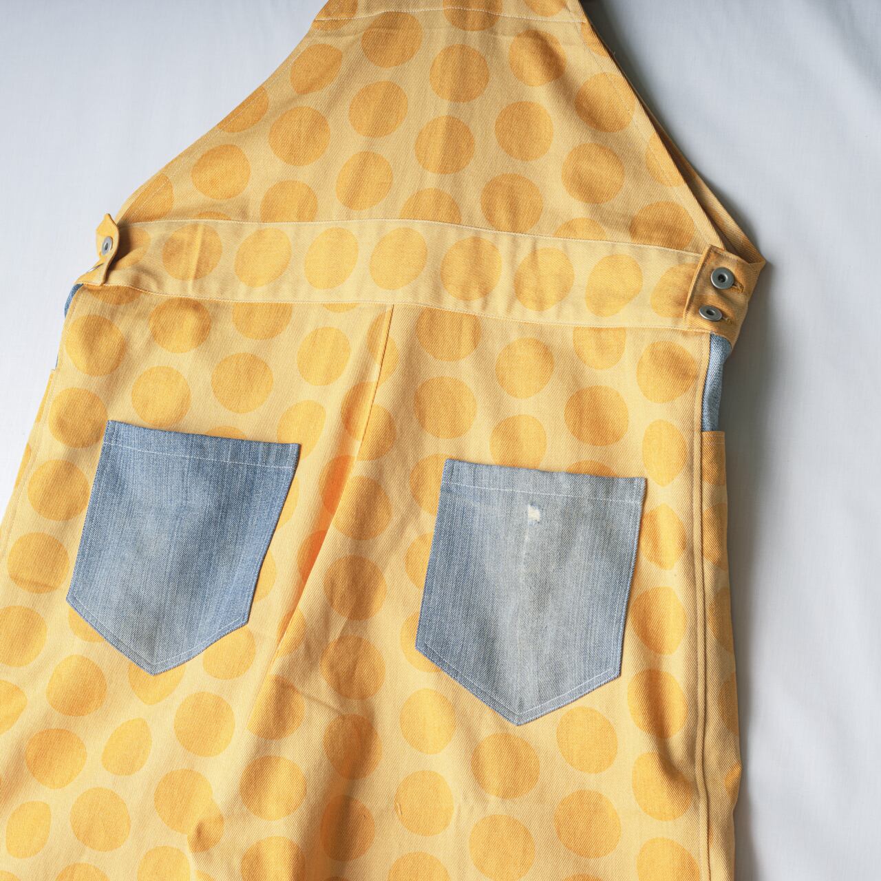 使用感のあるデニムポケットと、希少なドット柄の古い残反を組み合わせて仕立てたサロペットです。